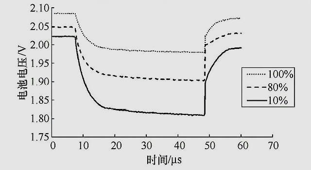 经过6ms的瞬间大电流放电后,容量为标称容量100%的电池,电压下降的幅度不大;容量为标称容量80%的电池,其电压最低下降至1.9V;容量为标称容量10%的电池,其电压下降至1.8V。